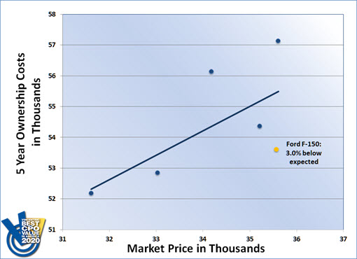 For an impressive fifth consecutive year, the Ford F-150 won the Vincentric Best CPO Value in America™ award in the Full-Size 1/2-Ton Pickup segment. The F-150 had the lowest maintenance, insurance, and total ownership costs in its class, which helped it return to the 2020 winner’s circle.