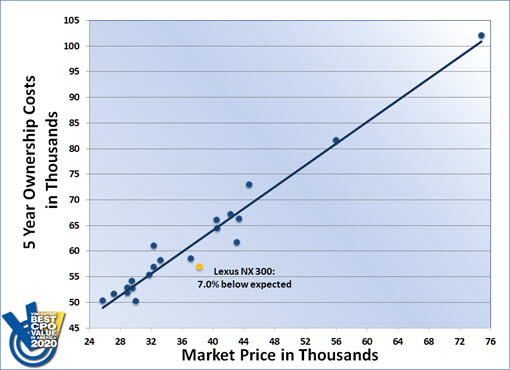The Lexus NX 300 won the 2020 Vincentric Best CPO Value in America™ award in the Luxury Compact SUV/Crossover segment. The NX 300’s lowest repair cost in its class was a key factor in its victory.