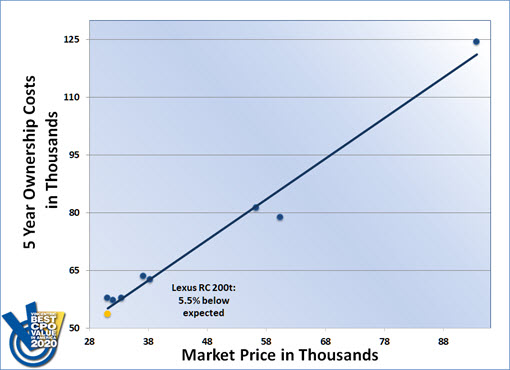 The 2020 Vincentric Best CPO Value in America™ award for the Luxury Coupe segment went to the Lexus RC 200t. The RC 200t had the lowest cost of ownership in its class, which helped deliver the win.