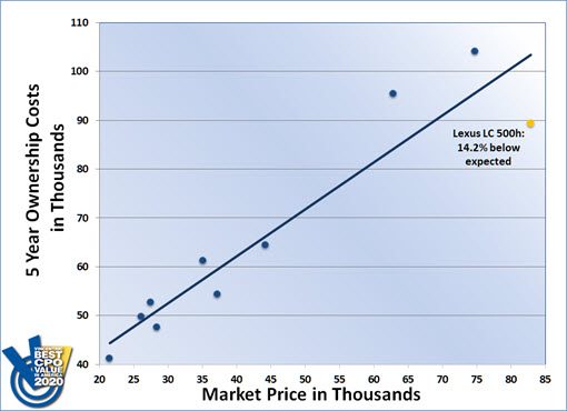 The Lexus LC 500h earned the 2020 Vincentric Best CPO Value in America™ award in the Luxury Hybrid segment. Having the lowest repair costs in its class helped the LC 500h take top honors.