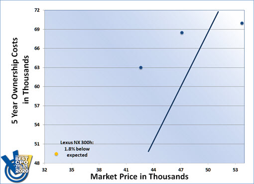 The Lexus NX 300h was honored with the 2020 Vincentric Best CPO Value in America™ award in the Luxury Hybrid SUV/Crossover segment. Having the lowest cost of ownership in its class helped the NX 300h bring home the win.