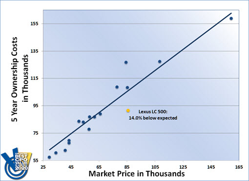The Lexus LC 500 was at the top of the podium in the Luxury Sports Car segment in the 2020 Vincentric Best CPO Value in America™ awards. Having the lowest repair and depreciation costs in its class were key factors in this year’s victory.