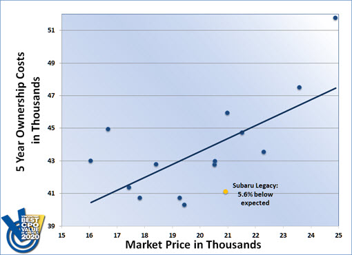 The Subaru Legacy earned the 2020 Vincentric Best CPO Value in America™ award in the Mid-Size segment. Having the lowest insurance cost in its class contributed to the strong performance that allowed the Legacy to outperform fourteen competitor models.