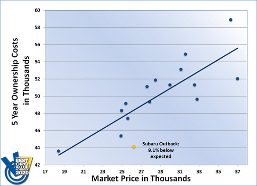 This is the third consecutive win for the Subaru Outback in the Mid-Size SUV/Crossover segment of the Vincentric Best CPO Value in America™ awards. Having the lowest insurance cost in its class was a key factor in the Outback’s repeat victory.