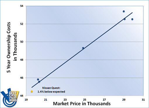 The Nissan Quest delivered best-in-class value, earning the 2020 Vincentric Best CPO Value in America™ award in the Minivan segment. The Quest outperformed its competitors by having the lowest cost of ownership in its class.