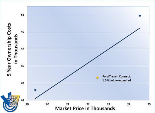 For the third consecutive year, the Ford Transit Connect was honored with the Vincentric Best CPO Value in America™ award in the Small Commercial Passenger Van segment. Having the lowest insurance, maintenance, and repair costs in its class helped bring the Transit Connect the victory.