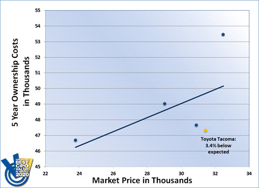 In the seven-year history of the Vincentric Best CPO Value in America™ awards, the Toyota Tacoma has been the winner of the Small/Mid-Size Pickup segment all seven years. For 2020 the Tacoma earned its win by having the lowest repair, maintenance, and total ownership costs in its class.