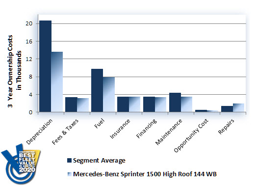 The Mercedes-Benz Sprinter 1500 High Roof 144 WB earned the top spot in the 2020 Vincentric Best Fleet Value in America™ awards for the Full-Size 1/2-Ton Passenger Van segment. Key factors in the Sprinter 1500's victory were having the lowest depreciation and maintenance costs—as well as the best fuel economy—in its class.