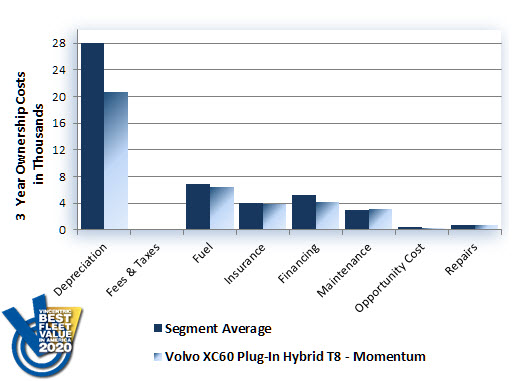 The Volvo XC60 Plug-In Hybrid T8 - Momentum came out on top of the Luxury Electric/Plug-In Hybrid SUV/Crossover segment in the 2020 Vincentric Best Fleet Value in America™ awards. Having the lowest depreciation costs, insurance costs, and best fuel economy in its class helped the XC60 Plug-In Hybrid outperform its competitors in all 28 measured lifecycle cost scenarios.