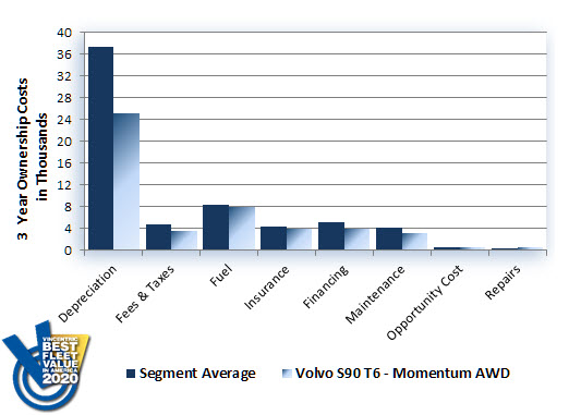 The Volvo S90 T6 - Momentum AWD won the 2020 Vincentric Best Fleet Value in America™ award in the Luxury Large Sedan segment. In an impressive showing the S90 won 25 of 28 measured lifecycle cost scenarios, in addition to having the lowest depreciation and fixed costs in its class.