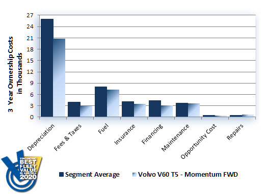 The Volvo V60 T5 – Momentum FWD won the Vincentric Best Fleet Value in America™ award in the Luxury Wagon segment for the second consecutive year. Having the best fuel economy, lowest depreciation costs, and lowest insurance costs in its class helped propel the V60 to victory.