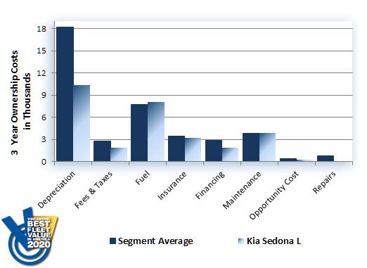 For the second year in a row, the Kia Sedona L earned the Vincentric Best Fleet Value in America™ award in the Minivan segment. Having the lowest insurance and repair costs in its class led the Sedona to the top of the 2020 podium.