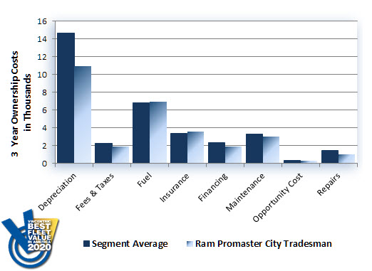 The Small Commercial Passenger Van segment of the 2020 Vincentric Best Fleet Value in America™ awards was won by the Ram Promaster City Tradesman. Having the lowest depreciation and repair costs in its class helped the Promaster City Tradesman earn its second victory in this segment.