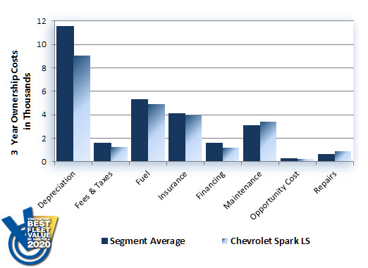 The Chevrolet Spark LS earned the 2020 Vincentric Best Fleet Value in America™ award in the Subcompact Hatchback segment, aided by having the lowest depreciation and fixed costs in its class. The Spark LS outperformed 7 competitor vehicle trims and won over half of the 28 measured lifecycle cost scenarios.