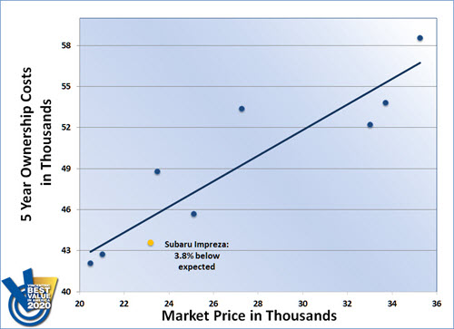 For the second consecutive year, the Subaru Impreza took home the Compact Hatchback category win in the Vincentric Best Value in America™ awards. The Impreza outperformed 8 competitor models to earn this repeat victory.
