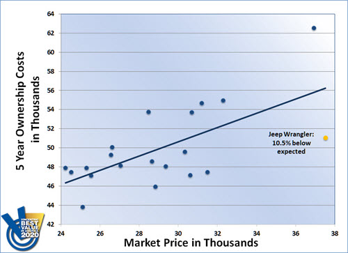 The Jeep Wrangler took home the 2020 Vincentric Best Value in America™ award in the Compact SUV/Crossover segment. This is the sixth time the Wrangler has sat atop the podium. Its lowest depreciation cost in its class helped deliver the 2020 win.