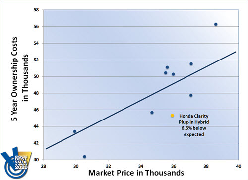 For the second consecutive year, the Honda Clarity Plug-In Hybrid took home the win for the Electric/Plug-In Hybrid segment of the Vincentric Best Value in America™ awards. The Clarity Plug-In Hybrid outperformed 9 competitor models in order to earn its place atop the 2020 podium.