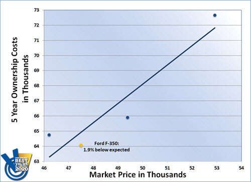 The Ford F-350 won the 2020 Vincentric Best Value in America™ award for the Full-Size 1-Ton Pickup segment. The F-350 outperformed its competitors for the sixth time this year, aided by having the best fuel economy, lowest insurance cost, lowest repair cost, and lowest total ownership cost in its class.