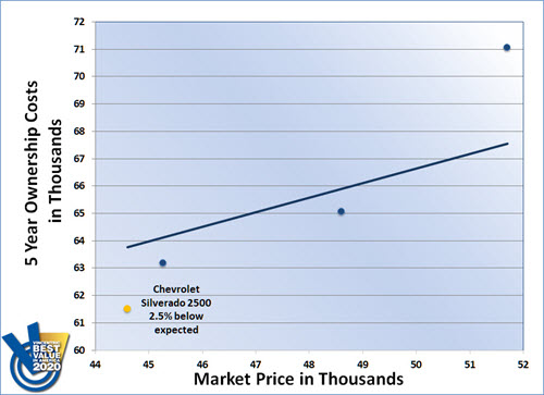 In an impressive repeat victory, the Chevrolet Silverado 2500 won the 2020 Vincentric Best Value in America™ award in the Full-Size 3/4-Ton Pickup segment. This year marks the tenth time that the Silverado 2500 has won this segment. Having the lowest depreciation, insurance, repair, and total ownership costs in its class helped the Silverado 2500 return to its familiar place in the winner's circle.