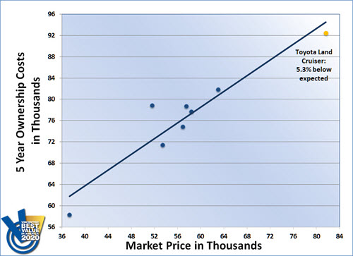The Toyota Land Cruiser won the 2020 Vincentric Best Value in America™ award in the Large SUV/Crossover category. This is the ninth victory in this segment for the Land Cruiser, with the award earned by outperforming 6 competitor vehicles.