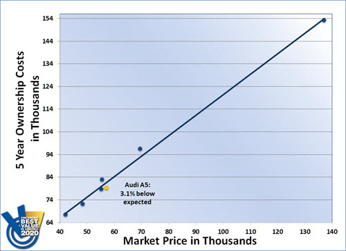 2020 marks the second year in a row that the Audi A5 has won the Vincentric Best Value in America™ award in the Luxury Convertible segment. This repeat victory was helped by the A5 having the lowest maintenance cost in its class.