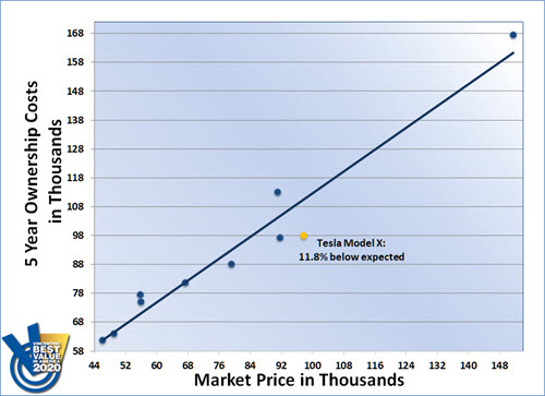 The Tesla Model X won the 2020 Vincentric Best Value in America™ award for the Luxury Electric/Plug-In Hybrid segment. The Model X outperformed 7 competitor models, with the lowest depreciation rate in its class helping deliver it to the 2020 winner's circle.