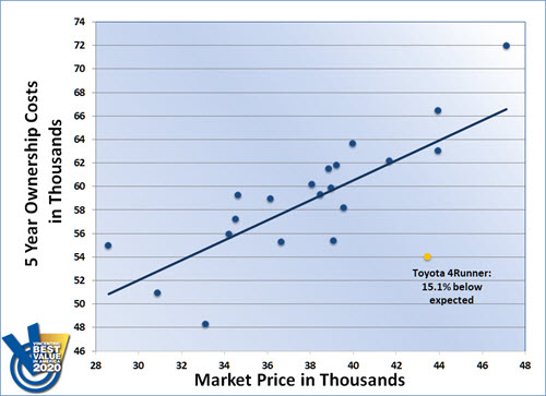 The Toyota 4Runner is a familiar name in the Vincentric Best Value in America™ winner's circle. Not only is this the 4Runner's fourth consecutive win in the Mid-Size SUV/Crossover category, but 2020 also marks the tenth time the Toyota 4Runner has been on top of this segment. Having the lowest depreciation rate in its class helped the 4Runner to this year's victory.