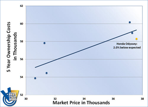 The Honda Odyssey is on familiar ground as this year's Vincentric Best Value in America™ award winner in the Minivan category. Aided by having the best fuel economy, lowest depreciation rate, and lowest insurance cost in its class, the Odyssey outperformed its competitors for the tenth time.