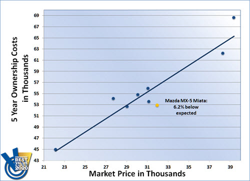 This is the second consecutive year the Mazda MX-5 Miata has won the Sports Car segment of the Vincentric Best Value in America™ awards. The MX-5 Miata's 2020 victory was aided by having the lowest insurance cost in its class.