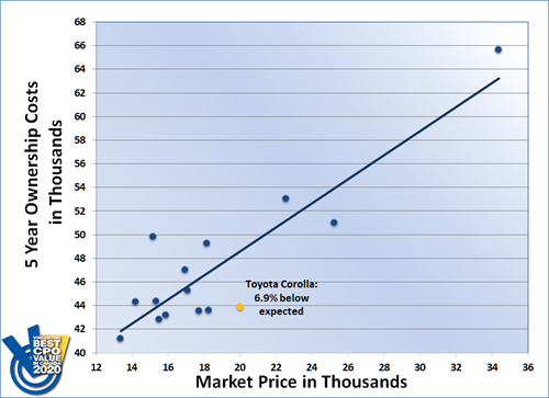 The 2020 Vincentric Best CPO Value in Canada Awards are based on the average of all trim levels for each model from the 2015-2019 model years. Costs are based on 5 years of ownership with annual mileage of 20,000 kilometers. Graph shown is a visual representation of the actual results, but may not reflect the exact calculations. To learn more about this graph and how Vincentric measures value, click here.