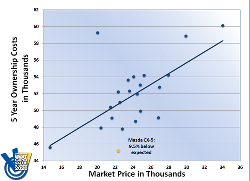 The Mazda CX-5 won the 2020 Vincentric Best CPO Value in Canada™ award in the Compact SUV/Crossover segment, making this the second consecutive time the CX-5 has been in the winner's circle. Its lowest operating costs in its class was a key factor in outperforming 21 competitor vehicles.