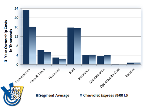 The Chevrolet Express 3500 LS 155 WB triumphed in the Full-Size 1-Ton Passenger Van segment of the 2020 Vincentric Best Fleet Value in Canada™ awards. With the lowest depreciation costs in its class, this year's award-winning performance marks the fifth win in this segment for the Express 3500.