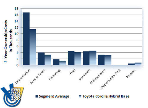 The Toyota Corolla Hybrid Base won the 2020 Vincentric Best Fleet Value in Canada™ award in the Hybrid segment, aided by having the lowest depreciation and fixed costs in its class.