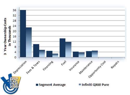 The Infiniti QX60 Pure AWD took the top of the podium in the Luxury Large SUV/Crossover segment of the 2020 Vincentric Best Fleet Value in Canada™ awards. No stranger to the winner's circle, this year is the fifth consecutive year that the QX60 has won this segment, as well as the second consecutive year for the QX60 Pure. In an impressive performance, the QX60 Pure had the lowest depreciation, fixed, operating, insurance, and repair costs in its class, along with the best fuel economy in its class.