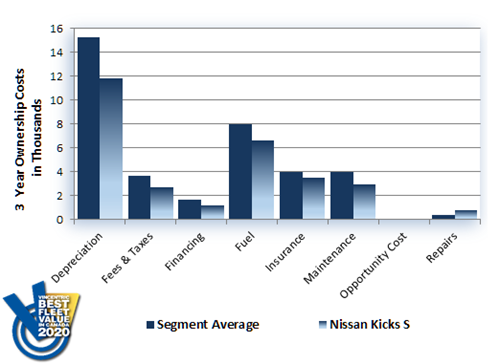 The Nissan Kicks S earned the 2020 Vincentric Best Fleet Value in Canada™ award in the Subcompact SUV/Crossover segment, aided by its best fuel economy in its class.