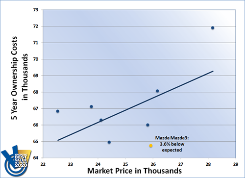 The Mazda3 earned the 2020 Vincentric Best Value in Canada™ award in the Compact segment, making this the fourth time it has been in the winner's circle. In addition to having the lowest total cost of ownership in its class, the Mazda3's win was helped by having the lowest maintenance costs in its class.