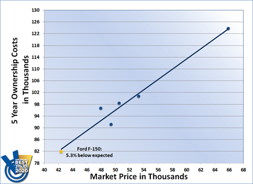 For an impressive sixth consecutive year, and eighth time overall, the Ford F-150 triumphed in the Full-Size 1/2-Ton Pickup segment of the Vincentric Best Value in Canada™ awards. The F-150 outperformed the competition by having the lowest insurance cost, best fuel economy, and lowest total cost of ownership in its class, propelling it to the 2020 victory.