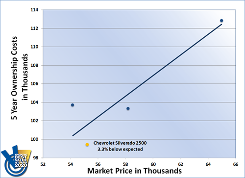 2020 marks the second time that the Chevrolet Silverado 2500 earned the Vincentric Best Value in Canada™ award for the Full-Size 3/4-Ton Pickup segment. The Silverado 2500 had an impressive performance with the lowest insurance, depreciation, repair, and total cost of ownership in its class.