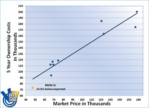 2020 marks the third time that the BMW i3 has won the Vincentric Best Value in Canada™ award in the Luxury Electric/Plug-In Hybrid segment. Having the lowest depreciation cost and total cost of ownership in its class helped the i3 take top honours.