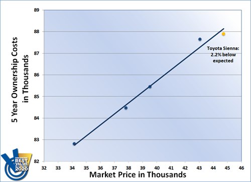 For the second year in a row, and third time overall, the Toyota Sienna won the Minivan segment of the Vincentric Best Value in Canada™ awards. The Sienna outperformed four competitor models to take home the 2020 victory.