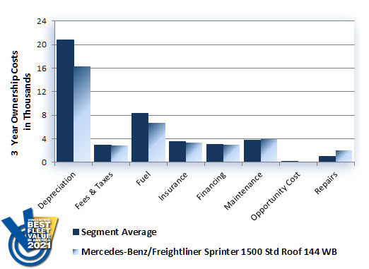 For the second consecutive year, the Mercedes-Benz/Freightliner Sprinter 1500 Std Roof 144 WB received the Vincentric Best Fleet Value in America™ award in the Full-Size 1/2-Ton Cargo Van segment. Having the best fuel economy in its class helped lead the Sprinter 1500 to the 2021 winner's circle.