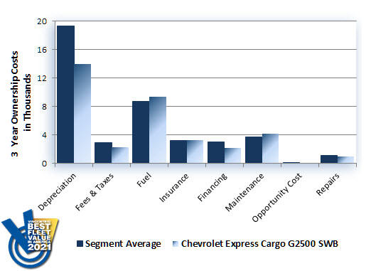 The Chevrolet Express Cargo G2500 SWB triumphed in the Full-Size 3/4-Ton Cargo Van segment of the 2021 Vincentric Best Fleet Value in America™ awards. The Express Cargo G2500 SWB demonstrated its best-in-class value by outperforming 18 competitor trims in 21 out of 28 measured lifecycle cost scenarios.