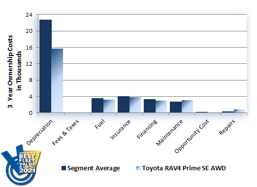 The Toyota RAV4 Prime SE AWD triumphed in the Electric/Plug-In Hybrid SUV/Crossover segment of the 2021 Vincentric Best Fleet Value in America™ awards. The RAV4 Prime rose to the top of the podium by outperforming the competition in 25 out of 28 measured lifecycle cost scenarios.