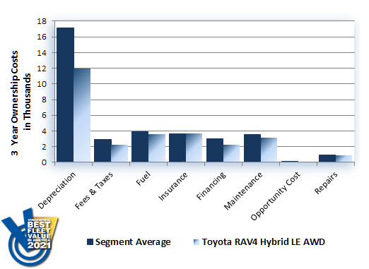 The Toyota RAV4 Hybrid LE AWD was honored with the 2021 Vincentric Best Fleet Value in America™ award in the Hybrid SUV/Crossover segment. The RAV4 Hybrid demonstrated its best-in-class value by winning all 28 measured lifecycle cost scenarios.
