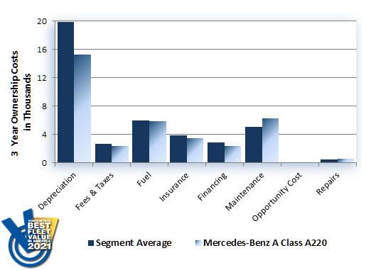 The Mercedes-Benz A Class A220 earned the top spot in the Luxury Compact segment of the 2021 Vincentric Best Fleet Value in America™ awards. Having the lowest depreciation and insurance costs in its class helped lead the A Class A220 to victory.