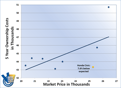 For an outstanding tenth time, the Honda Civic triumphed in the Compact segment of the Vincentric Best Value in America™ awards. Having the best fuel economy in its class was a key factor that led the Civic to the top of the 2021 podium.