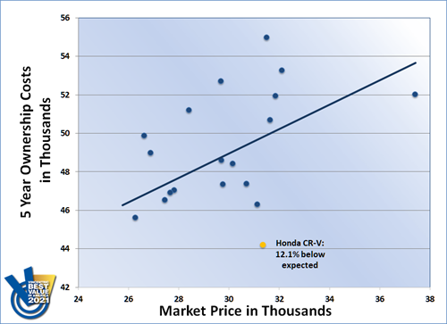 The Honda CR-V is on familiar ground as this year's Vincentric Best Value in America™ award winner in the Compact SUV/Crossover segment. Aided by having the best fuel economy in its class, 2021 marks the tenth time that the CR-V has triumphed in this segment.