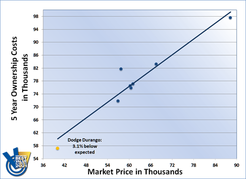 The Large SUV/Crossover segment of the 2021 Vincentric Best Value in America™ awards was won by the Dodge Durango. Having the lowest depreciation and operating costs in its class helped the Durango take top honors.