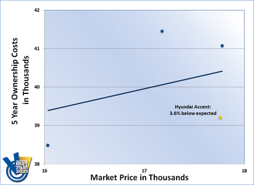 The Hyundai Accent won the 2021 Vincentric Best Value in America™ award in the Subcompact segment. Having the lowest repair cost in its class helped it earn top honors for the third time.