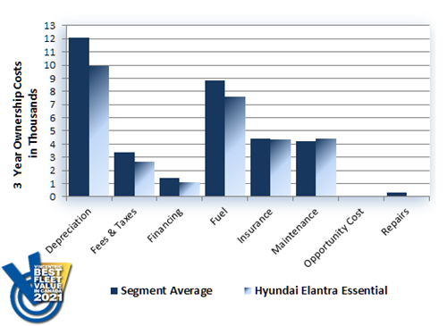 The Hyundai Elantra Essential claimed the win in the Compact segment of the Vincentric Best Fleet Value in Canada™ awards, making this the fourth time overall for the Elantra and the second consecutive win in this segment for the Essential trim level. The 2021 win was aided by having the best fuel economy in its class, as well as the lowest operating and repair costs.